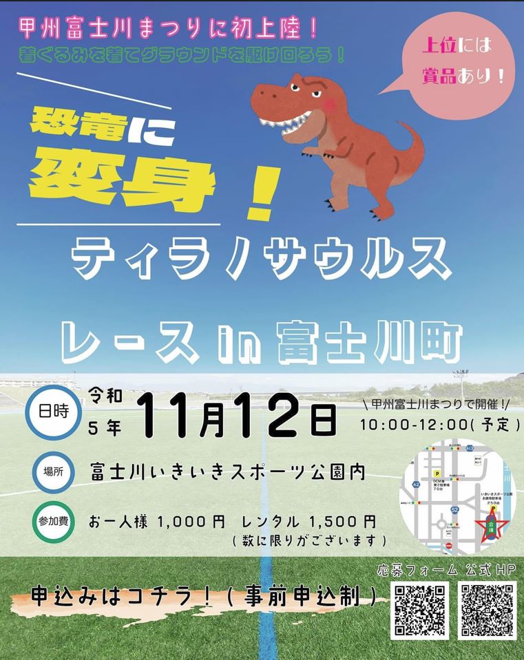 スマホの方は最下部に【サイドバー】を表示することにより全国のレース会場を確認できます。 2023年11月12日(日) ティラノサウルスレース in 富士川町 富士川いきいきスポーツ公園 19:山梨 X Facebook LINE コピー 2023.10.232025.12.29 主催者ホームページ 今年も甲州富士川まつりに上陸!第3回ティラノサウルスレース!今年も甲州富士川まつりに上陸!第3回ティラノサウルスレース! 「第3回 ティラノサウルスレースin富士川町」参加者募集チラシ 【参加申込みフォームはこちら】 ちまたで話題の・・・ティラ...