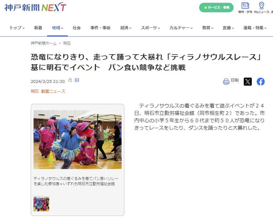 スマホの方は最下部に【サイドバー】を表示することにより全国のレース会場を確認できます。 2024年3月24日(日) ティラノサウルスレース 明石市立勤労福祉会館 兵庫県明石市 28:兵庫 X Facebook LINE コピー 2023.11.292025.12.29 神戸新聞NEXT https://www.kobe-np.co.jp/news/akashi/202403/0017471725.shtml