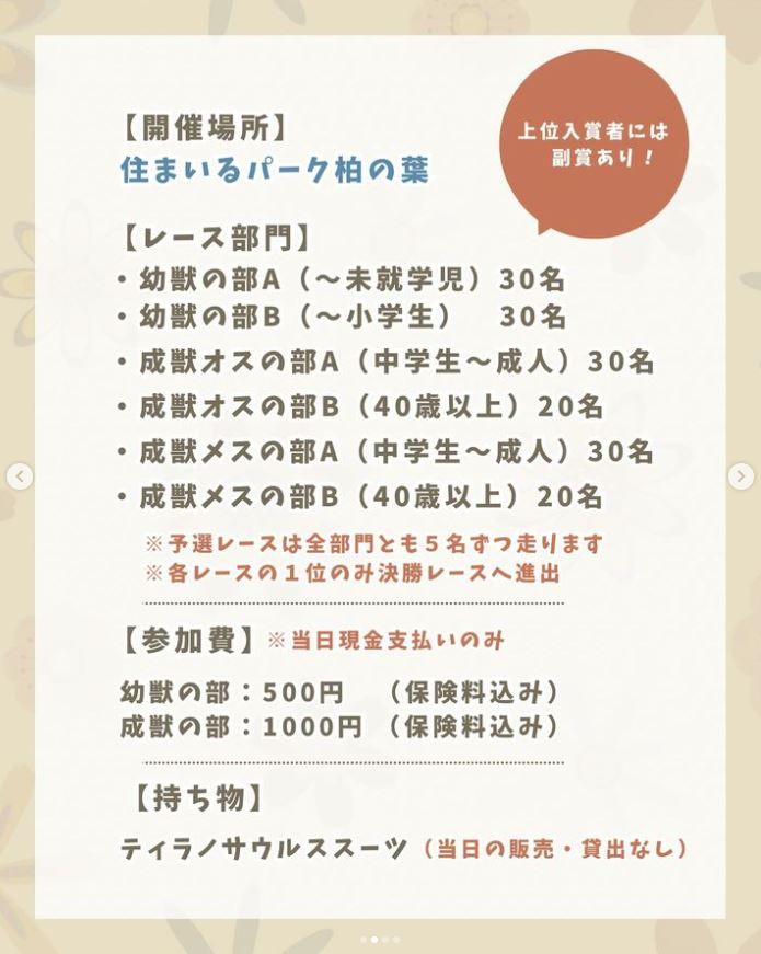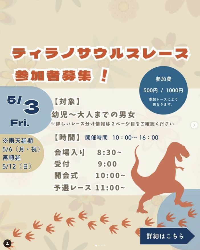 スマホの方は最下部に【サイドバー】を表示することにより全国のレース会場を確認できます。 2024年5月3日(金・祝) ティラノサウルスレース すまいるぱーくKashiwa no ha 住まいるパーク柏の葉 千葉県柏市 12:千葉 X Facebook LINE コピー 2024.01.052025.12.29 主催者Instagram 申込フォームがどこだかわかりづらいのでご自身でお探しください。 ブラウザーをアップデートしてください