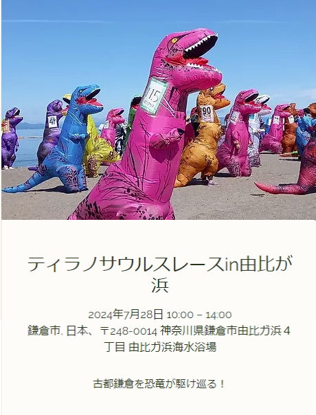 スマホの方は最下部に【サイドバー】を表示することにより全国のレース会場を確認できます。 2024年7月28日(日) ティラノサウルスレース in 由比が浜 神奈川県鎌倉市 14:神奈川 X Facebook LINE コピー 2024.01.072025.12.29 主催者ホームページ ティラノサウルスレースin由比が浜 | My Site 1古都鎌倉を恐竜が駆け巡る!