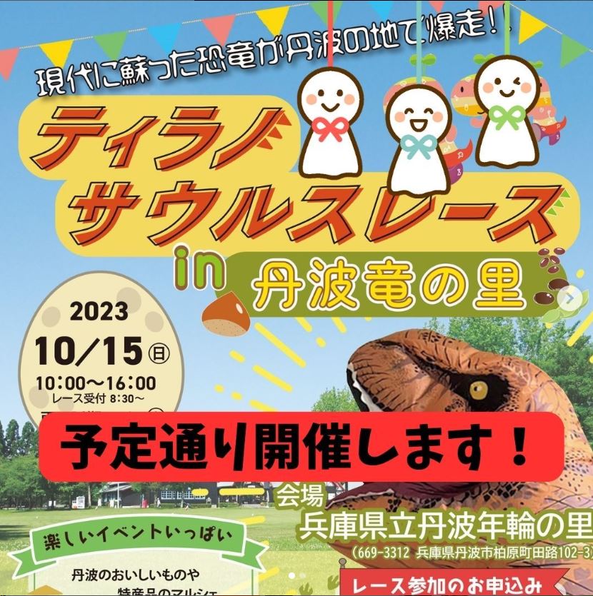 10月18日(土) 予定通り開催いたします!レース参加者のみなさまは受付開始時間8時となっておりますのでよろしくお願いいたします。どうぞお気をつけてお越しください。ティラノサウルスレースin丹波2025参加申込をされた皆さまへ参加申込いただいた皆様ありがとうございました。お申込みいただいた方は、全員参加していただけるこ...