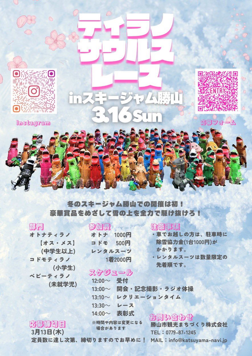スマホの方は最下部に【サイドバー】を表示することにより全国のレース会場を確認できます。 2025年3月16日(日) ティラノサウルスレース in スキージャム勝山 福井県勝山市 18:福井 X Facebook LINE コピー 2025.01.032025.12.29 主催者ホームページ ページが見つかりませんでした ※レースの規模や雰囲気は主催者ホームページ等でご自身でご確認のほどよろしくお願いします