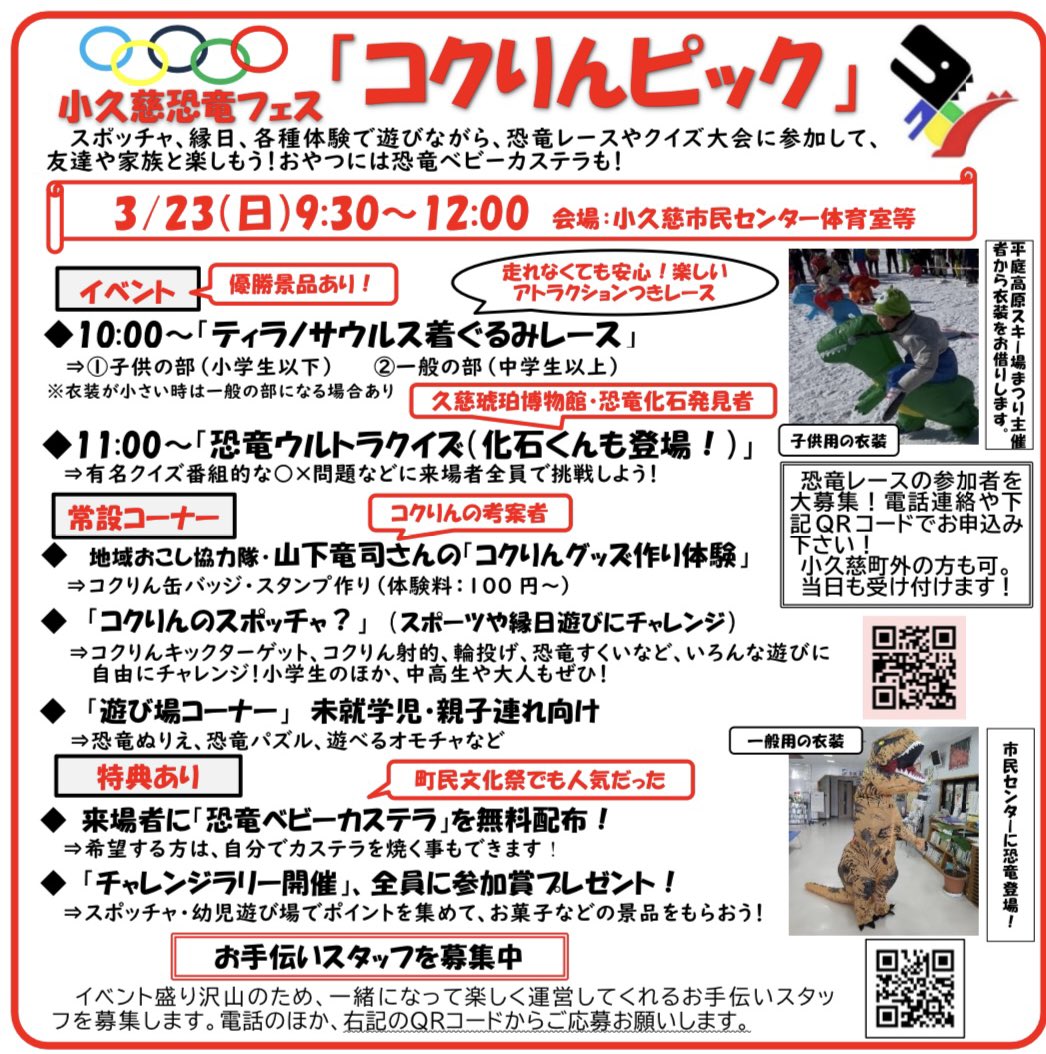 小久慈恐竜フェス「コクりんピック」を3/23(日)開催🦖楽しい企画いっぱい🎵 ティラノ着ぐるみレースや恐竜ウルトラクイズ、スポッチャ的?遊び場や幼児コーナー等⭐️ ティラノレースの参加者大募集✨ 応募は下記アドレスからのメール又はセンターにお電話下さい🙇 応募↓