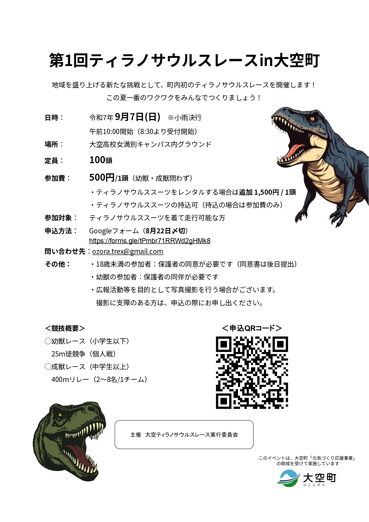 スマホの方は最下部に【サイドバー】を表示することにより全国のレース会場を確認できます。 2025年9月7日(日) 第1回ティラノサウルスレース in 大空町 大空高校女満別キャンパス内グラウンド 北海道大空町 01:北海道 X Facebook LINE コピー 2025.07.092025.12.29 申込フォーム ティラノサウルスレース in 大空町 参加申込フォーム ※レースの規模や雰囲気は主催者ホームページ等でご自身でご確認のほどよろしくお願いします
