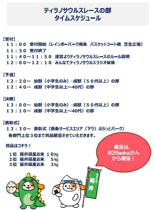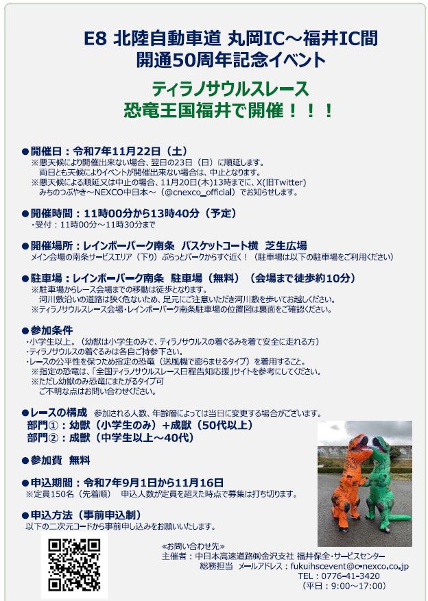 スマホの方は最下部に【サイドバー】を表示することにより全国のレース会場を確認できます。 2025年11月22日(土)【参加費無料】ティラノサルスレース 恐竜王国福井で開催!! E8北陸自動車道 丸岡IC~福井IC間 開通50周年記念イベント レインボーパーク南条 バスケットコート横 芝生広場 福井県南条郡南越前町 18:福井 X Facebook LINE コピー 2025.07.112025.12.28 申込フォーム E8北陸自動車道丸岡IC~福井IC開通50周年記念イベント ティラノサウルスレース ※レースの規模や雰囲気は主催者ホームページ等でご自身でご確認のほどよろしくお願いします