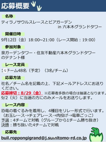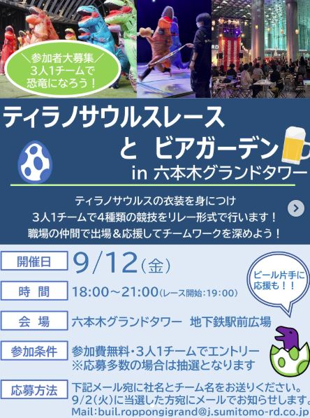 スマホの方は最下部に【サイドバー】を表示することにより全国のレース会場を確認できます。 2025年9月12日(金) ティラノサウルスレースとビアガーデン in 六本木グランドタワー 地下鉄駅前広場 東京都港区 13:東京 X Facebook LINE コピー 2025.07.092025.12.29 主催者インスタグラム Instagram ※レースの規模や雰囲気は主催者ホームページ等でご自身でご確認のほどよろしくお願いします