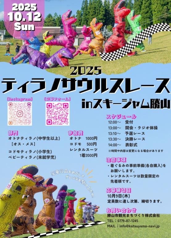 スマホの方は最下部に【サイドバー】を表示することにより全国のレース会場を確認できます。 2025年10月12日(日) ティラノサウルスレース in スキージャム勝山 2025 福井県勝山市 18:福井 X Facebook LINE コピー 2025.07.102025.12.28 紹介ホームページ 【10月12日開催】「ティラノサウルスレースinスキージャム勝山2025」エントリー開始!! - 勝山観光ナビ注目~📣 ティラノサウルスレース、今年も開催!🦖 昨年、109体のティラノがゲレンデを駆け上がったあの熱狂が、 ※レースの規模や雰囲気は主催者ホームページ等でご自身でご確認のほどよろしくお願いします