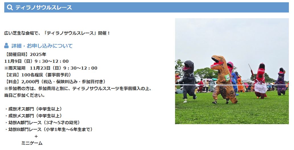 スマホの方は最下部に【サイドバー】を表示することにより全国のレース会場を確認できます。 【中止】2025年11月9日(日) 第5回 淀川ティラノサウルスレース(枚方地区) 淀川河川公園 大阪府枚方市 27:大阪 X Facebook LINE コピー 2025.07.112025.12.28 主催者ホームページ 淀川ティラノサウルスレース(枚方地区) | 淀川河川公園 ※レースの規模や雰囲気は主催者ホームページ等でご自身でご確認のほどよろしくお願いします