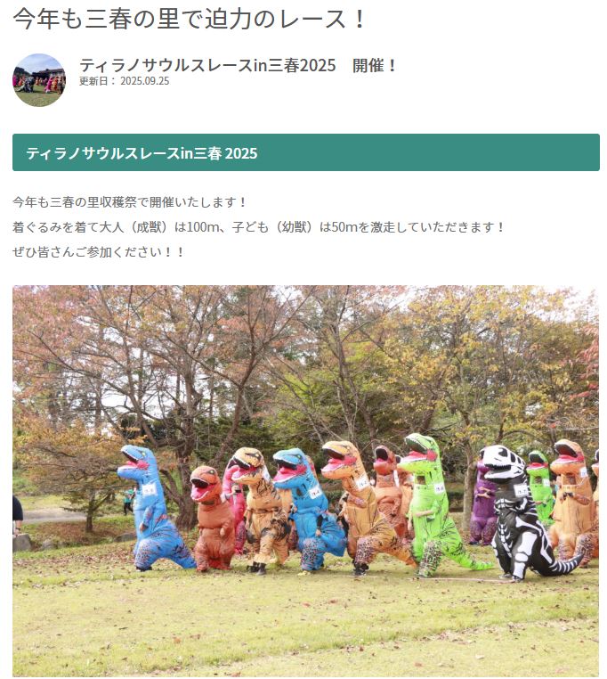 スマホの方は最下部に【サイドバー】を表示することにより全国のレース会場を確認できます。 2025年10月26日(日) ティラノサウルスレースin三春 2025 三春の里田園生活館 福島県田村郡三春町 07:福島 X Facebook LINE コピー 2025.07.102025.10.05 主催者ホームページ ティラノサウルスレースin三春2025 開催! | Find!三春 【みはる観光協会~福島県三春町】今年も三春の里で迫力のレース! ※レースの規模や雰囲気は主催者ホームページ等でご自身でご確認のほどよろしくお願いします