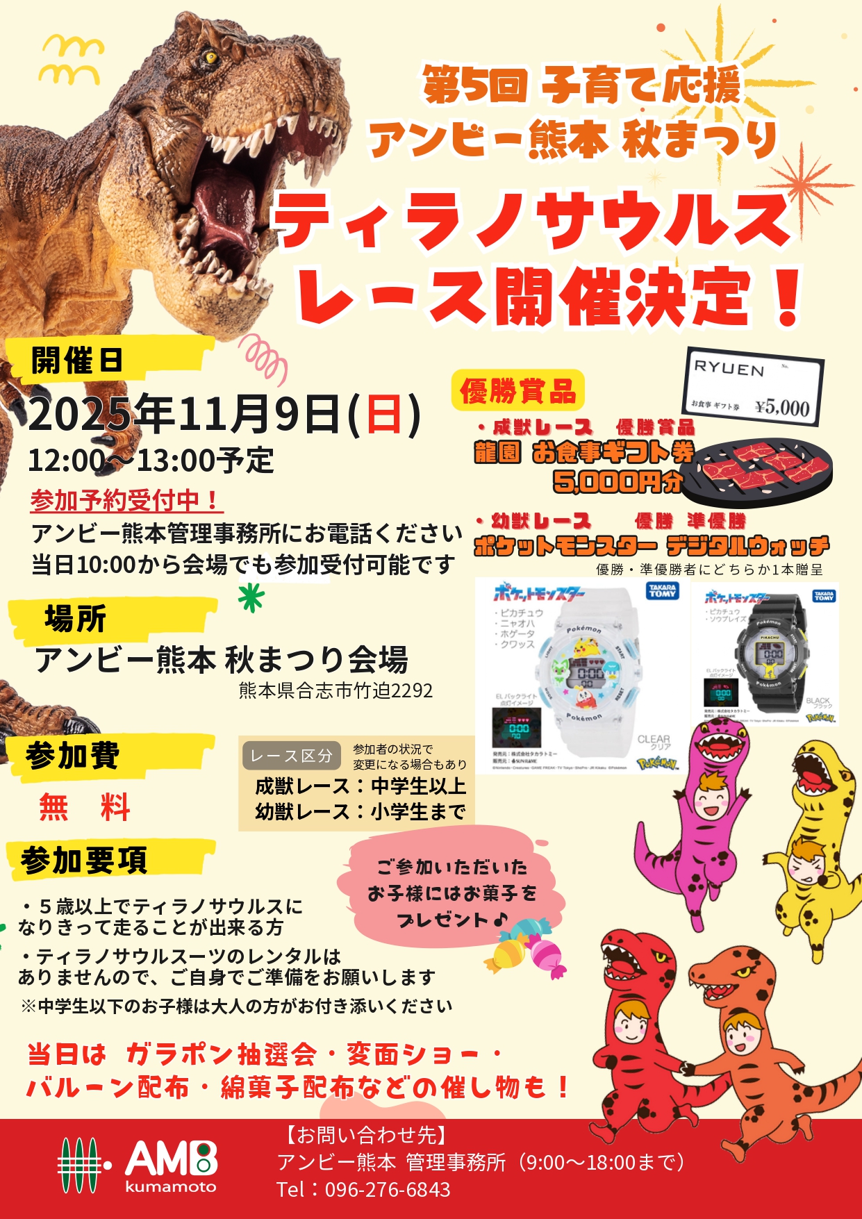 スマホの方は最下部に【サイドバー】を表示することにより全国のレース会場を確認できます。 2025年11月9日(日) 第5回子育て応援 アンビー熊本 秋まつり 内のティラノサウルスレース アンビー熊本 熊本県合志市 43:熊本 X Facebook LINE コピー 2025.07.112025.12.28 主催者ホームページ 【アンビー熊本秋まつり】ティラノサウルスレース - アンビー熊本 熊本県合志市【公式サイト】アンビー熊本秋まつりにて 【ティラノサウルスレース】開催決定! ティラノサウルスになりきって、ぜひ走ってくださ ※レースの規模や雰囲気は主催者ホームページ等でご自身でご確認のほどよろしくお願いします