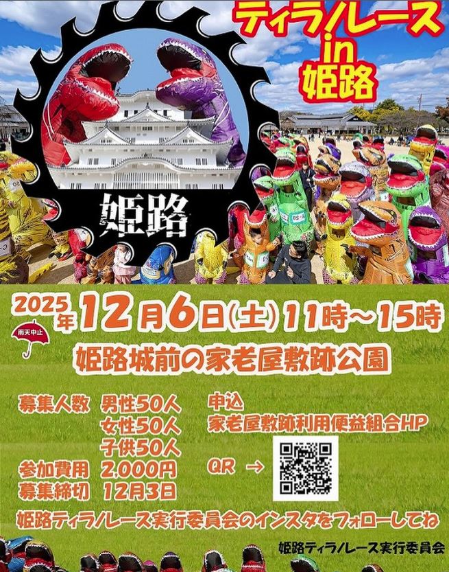 72 likes, 0 comments - himeji.tirano on September 6, 2025: "第5回ティラノレースin姫路 申込 ●概要 開催日 2025年12月6日(土)11:00~15:00(受付開始10:00) 開催場所 姫路城前の家老屋敷跡公園 募集人数 各50人(計150人) 参加費...