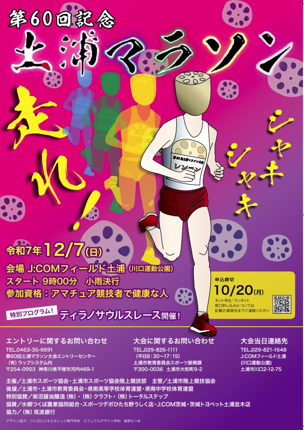 スマホの方は最下部に【サイドバー】を表示することにより全国のレース会場を確認できます。 2025年12月7日(日) 第60回土浦マラソン 内の ティラノサウルスレース J:COMフィールド土浦(川口運動公園内) 茨城県土浦市 08:茨城 X Facebook LINE コピー 2025.07.122025.12.27 主催者ホームページ 第60回土浦マラソンを開催します!!第60回土浦マラソンを開催します‼今大会は、60回大会記念として、ティラノサウルスレースも併せて開催します!ティラノサウルスの着ぐるみを着て駆けぬけよう!日時 令和7年12月7... ※レースの規模や雰囲気は主催者ホームページ等でご自身でご確認のほどよろしくお願いします