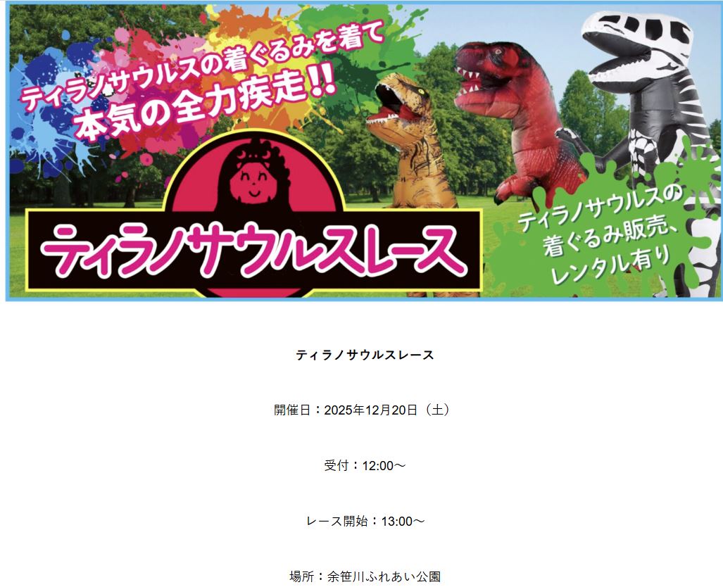 スマホの方は最下部に【サイドバー】を表示することにより全国のレース会場を確認できます。 2025年12月20日(土) ティラノサウルスレース 余笹川ふれあい公園 栃木県那須郡那須町 09:栃木 X Facebook LINE コピー 2025.07.122025.12.27 主催者ホームページ ティラノサウルスレース2025.11.03 - 那須アミューズメントファクトリーGUYSくろいそふぇすてぃばる ティラノサウルスレース 開催日:2025年11月3日(月)文化の日 受付:12:00〜 ※レースの規模や雰囲気は主催者ホームページ等でご自身でご確認のほどよろしくお願いします