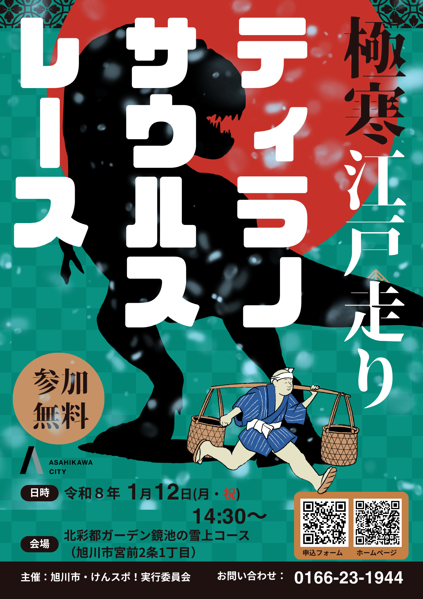 スマホの方は最下部に【サイドバー】を表示することにより全国のレース会場を確認できます。 2026年1月12日(月・祝) 極寒江戸走り ティラノサウルスレース 北彩都ガーデン鏡池の雪上コース 北海道旭川市 01:北海道 X Facebook LINE コピー 2025.12.012026.01.04 主催者ホームページ けんスポ! ~はじめの一歩~ | 旭川市自分の健康状態をアップデート!気軽にスポーツを体験!医療施設やスポーツ推進団体が協力して、健康的なカラダになるために市民の皆さんがスポーツを習慣化できるよう、充実のコンテンツでサポートしていきます。 ※レースの規模や雰囲気は主催者ホームページ等でご自身でご確認のほどよろしくお願いします