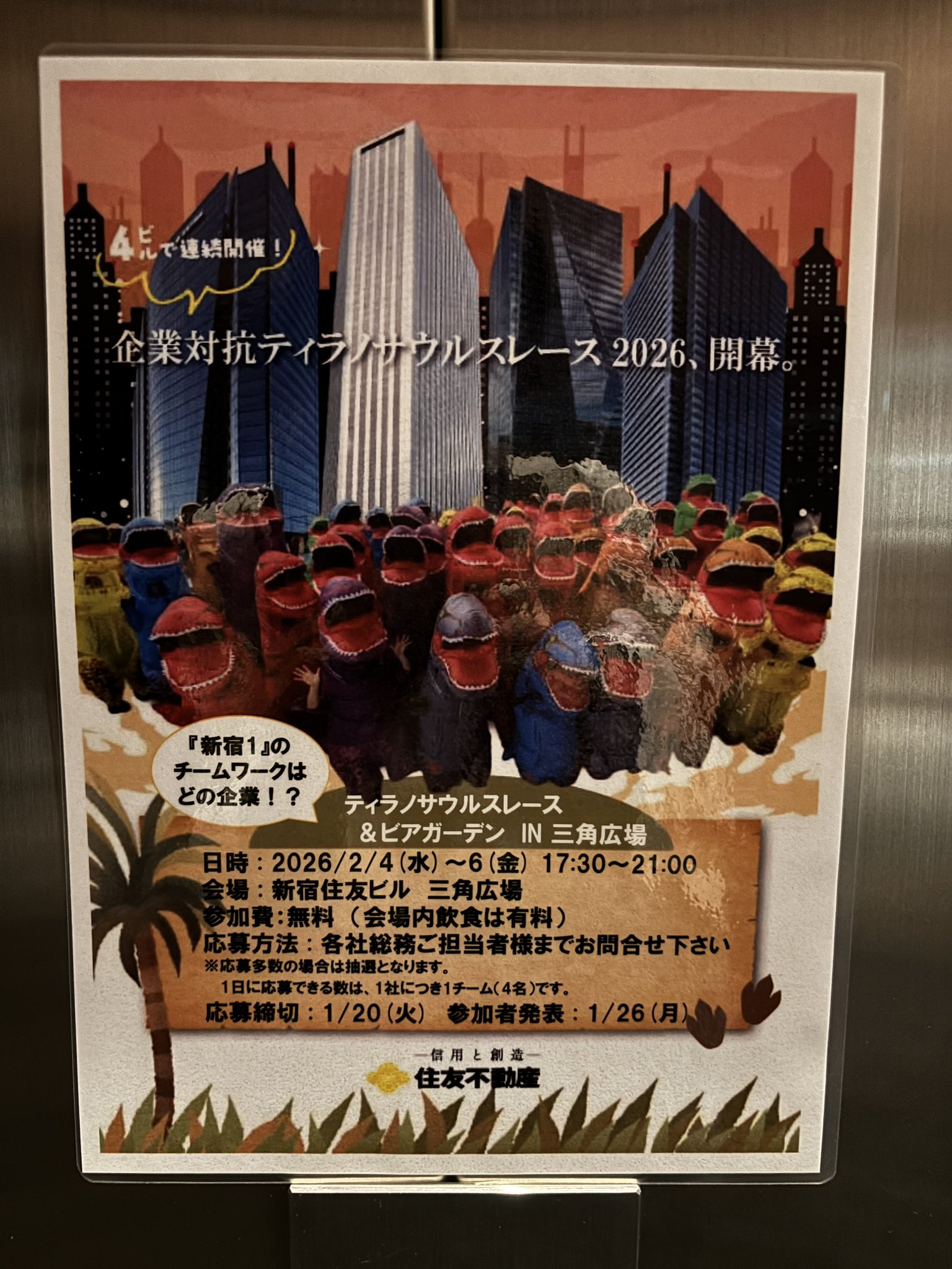 スマホの方は最下部に【サイドバー】を表示することにより全国のレース会場を確認できます。 2026年2月4日(水)~6日(金) 企業対抗ティラノサウルスレース 2026 ティラノサウルスレース&ビアガーデン IN 三角広場 東京都新宿区 13:東京 X Facebook LINE コピー 2025.12.022026.01.25 主催ホームページ 企業対抗ということで一般に募集はありません。 観覧はできるようですが、ビアガーデンということで有料になるのかと思われます ※レースの規模や雰囲気は主催者ホームページ等でご自身でご確認のほどよろしくお願いします