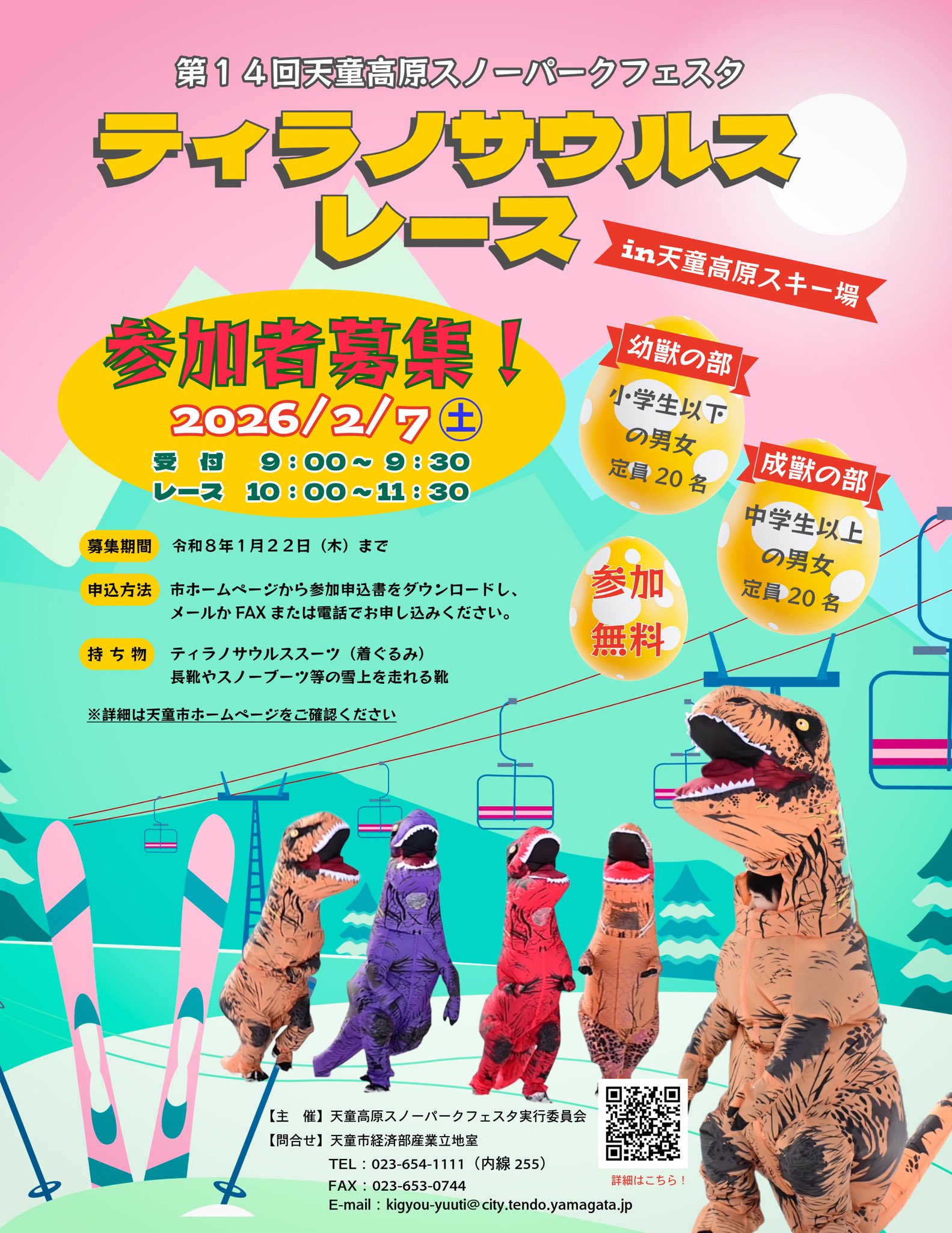 スマホの方は最下部に【サイドバー】を表示することにより全国のレース会場を確認できます。 2026年2月7日(土) 第14回天童高原スノーパークフェスタ ティラノサウルスレース in 天童高原スキー場 山形県天童市 06:山形 X Facebook LINE コピー 2025.12.022026.01.25 主催者ホームページ 山形県天童市/天童高原スノーパークフェスタ ※レースの規模や雰囲気は主催者ホームページ等でご自身でご確認のほどよろしくお願いします