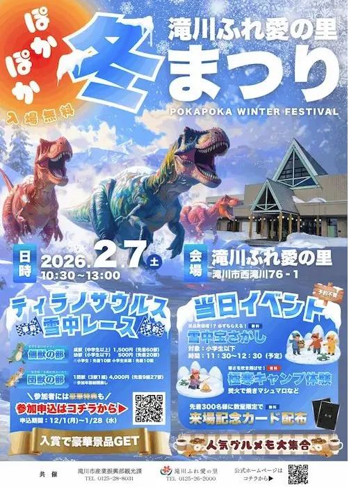 スマホの方は最下部に【サイドバー】を表示することにより全国のレース会場を確認できます。 2026年2月7日(土) ぽかぽか冬まつり 内のティラノサウルス雪中レース 滝川ふれ愛の里 北海道滝川市 01:北海道 X Facebook LINE コピー 2025.12.022026.01.25 主催者ホームページ 滝川ふれ愛の里ぽかぽか冬まつり ※レースの規模や雰囲気は主催者ホームページ等でご自身でご確認のほどよろしくお願いします