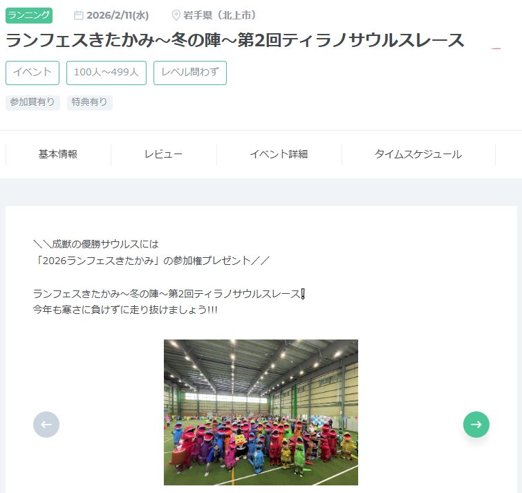 2026/2/11(水) / 岩手県北上市二子町馬場野3-15 / \\成獣の優勝サウルスには 「2026ランフェスきたかみ」の参加権プレゼント// ランフェスきたかみ~冬の陣~第2回ティラノサウルスレース❕ 今年も寒さに負けずに走り抜けましょう!!!【最初にお願い】 ☆日本ティラノサウルス競技連盟推奨の着ぐるみ .....