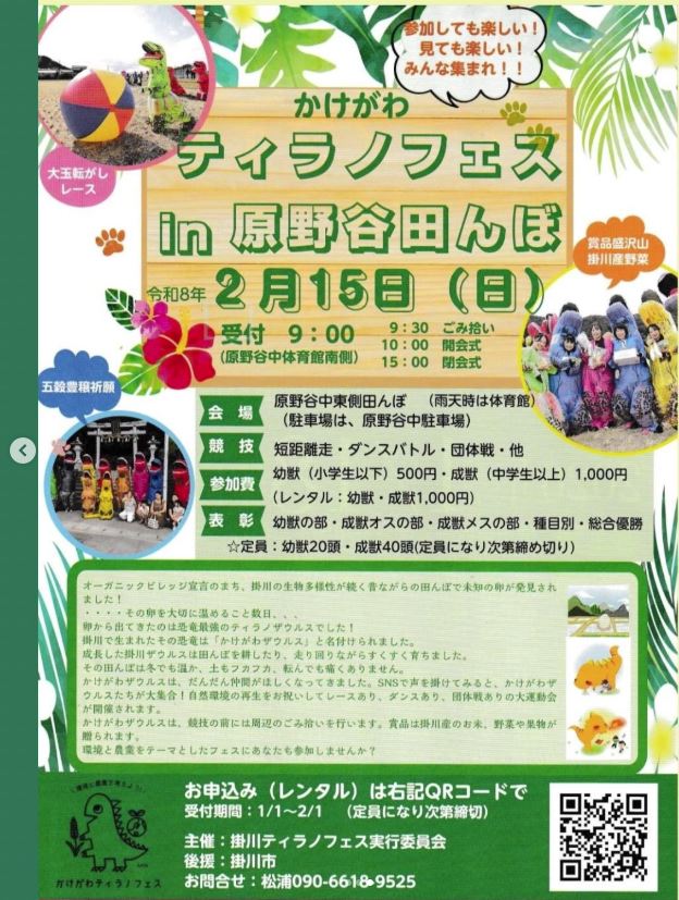 スマホの方は最下部に【サイドバー】を表示することにより全国のレース会場を確認できます。 2026年2月15日(日) かけがわ ティラノフェス in 原野谷田んぼ 原野谷中東側田んぼ 静岡県掛川市 22:静岡 X Facebook LINE コピー 2026.01.022026.02.02 主催者インスタグラム Instagram ※レースの規模や雰囲気は主催者ホームページ等でご自身でご確認のほどよろしくお願いします