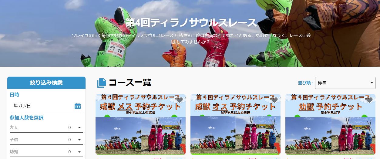ソレイユの丘で毎回大好評のティラノサウルスレース! 皆さん一度は動画などで見たことある、あの姿になって、レースに参加してみませんか?
