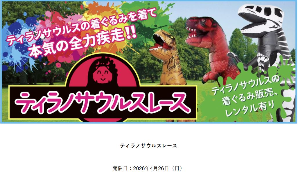 スマホの方は最下部に【サイドバー】を表示することにより全国のレース会場を確認できます。 2026年4月26日(日) ティラノサウルスレース 白河駅前広場 福島県白河市 07:福島 X Facebook LINE コピー 2026.01.042026.04.13 主催者ホームページ ティラノサウルスレース2025.11.03 - 那須アミューズメントファクトリーGUYSくろいそふぇすてぃばる ティラノサウルスレース 開催日:2025年11月3日(月)文化の日 受付:12:00〜 ※レースの規模や雰囲気は主催者ホームページ等でご自身でご確認のほどよろしくお願いします