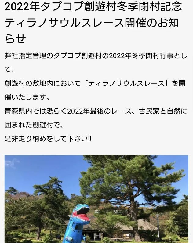 参加予定のみなさん、楽しみにしていたみなさん申し訳ありません🙇#青森県 #田子町 #タプコプ創遊村 #創遊村#ティラノサウルスレース #ティラノサウルス #イベント pic.twitter.com/V4vVnx5uci— 田子町観光協会 (@takkokanko) December 4, 2022