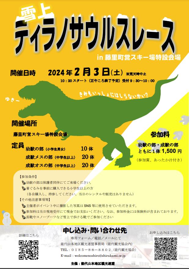 雪の上を爆走したいティラノさんたちのエントリー、お待ちしております🔥#藤里町 #秋田 #秋田イベントhttps://t.co/0d2ZLMVebD