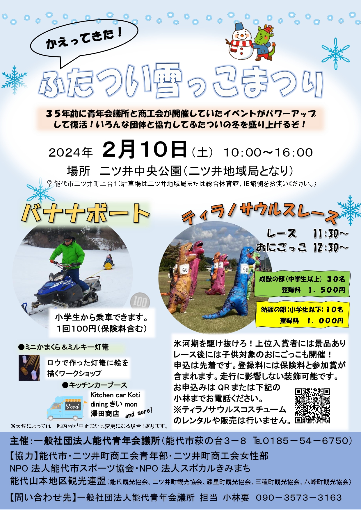 スマホの方は最下部に【サイドバー】を表示することにより全国のレース会場を確認できます。 2024年2月10日(土) ふたつい雪っこまつり ティラノサウルスレース 二ツ井中央公園 秋田県能代市 05:秋田 X Facebook LINE コピー 2023.11.032025.12.29 主催者ホームページ ふたつい雪っこまつり『ティラノサウルスレース』申込フォーム (google.com)