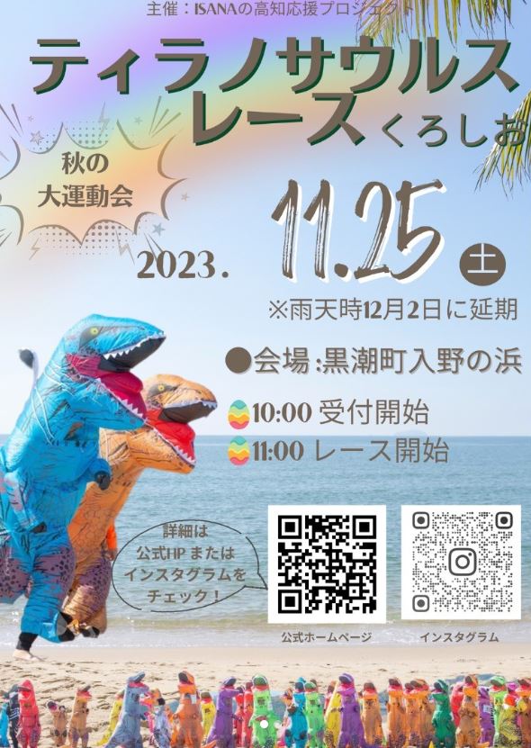 スマホの方は最下部に【サイドバー】を表示することにより全国のレース会場を確認できます。 2023年11月25日(土)第二回ティラノサウルスレースくろしお ~秋の大運動会~ 高知県黒潮町入野の浜 39:高知 X Facebook LINE コピー 2023.10.232025.12.29 主催者ホームページ ティラノサウルスレースくろしお (@t_rex_kuroshio) • Instagram photos and videos1,227 Followers, 1,250 Following, 96 Posts - See Instagram photos and videos from ティラノサウルスレースくろしお (@t_rex_kuroshio)